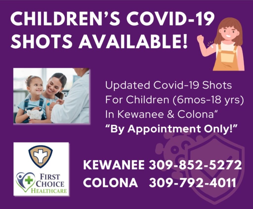 The Henry and Stark County Health Departments and First Choice Healthcare announced that this year’s updated Covid-19 shots for children ages 6 months to 18 are available at the First Choice Healthcare Clinics in both Colona and Kewanee.