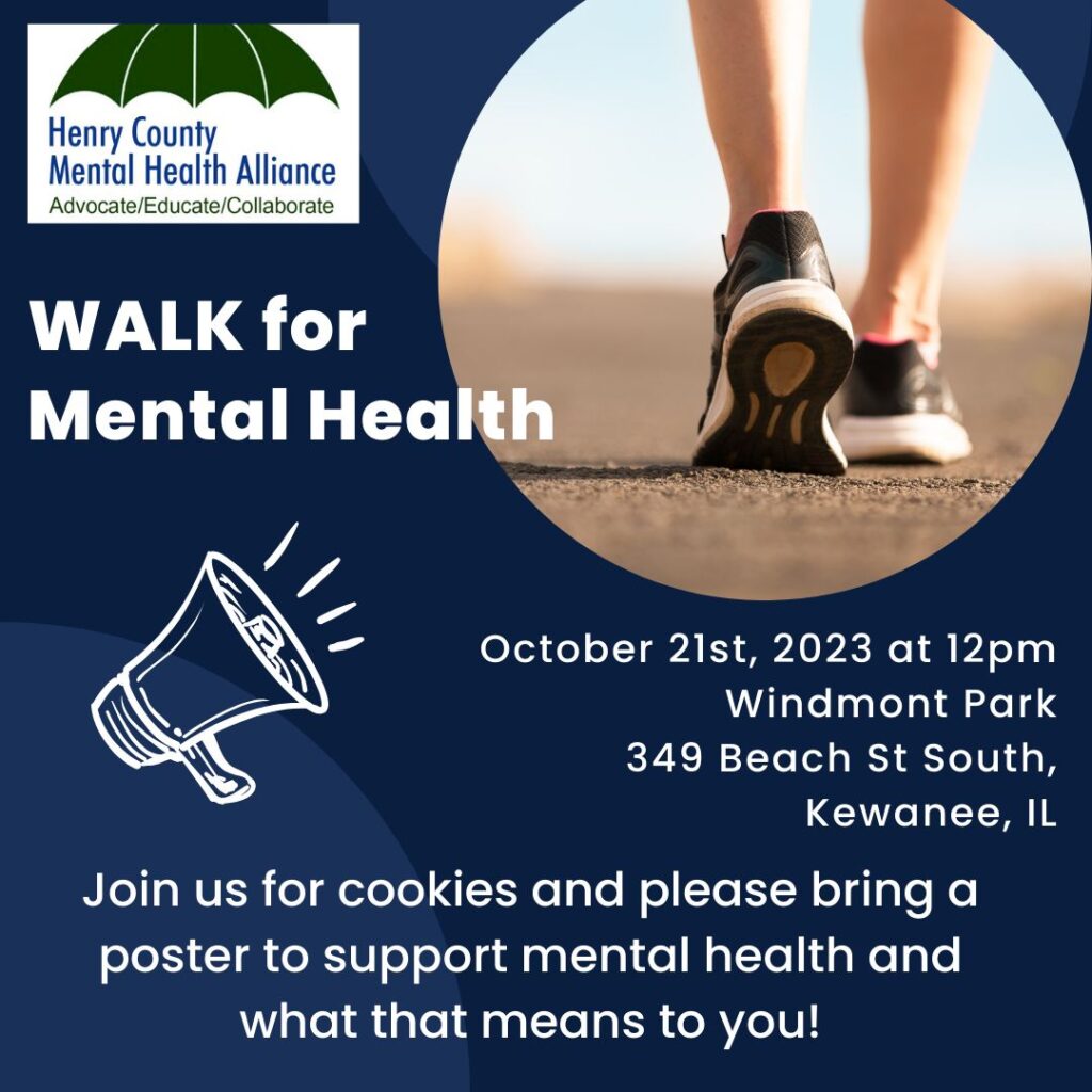 The Henry County Mental Health Alliance will hold a “Walk for Mental Health.” The event will be held at noon on Saturday, Oct. 21 at Windmont Park, located at 349 Beach St. South in Kewanee.