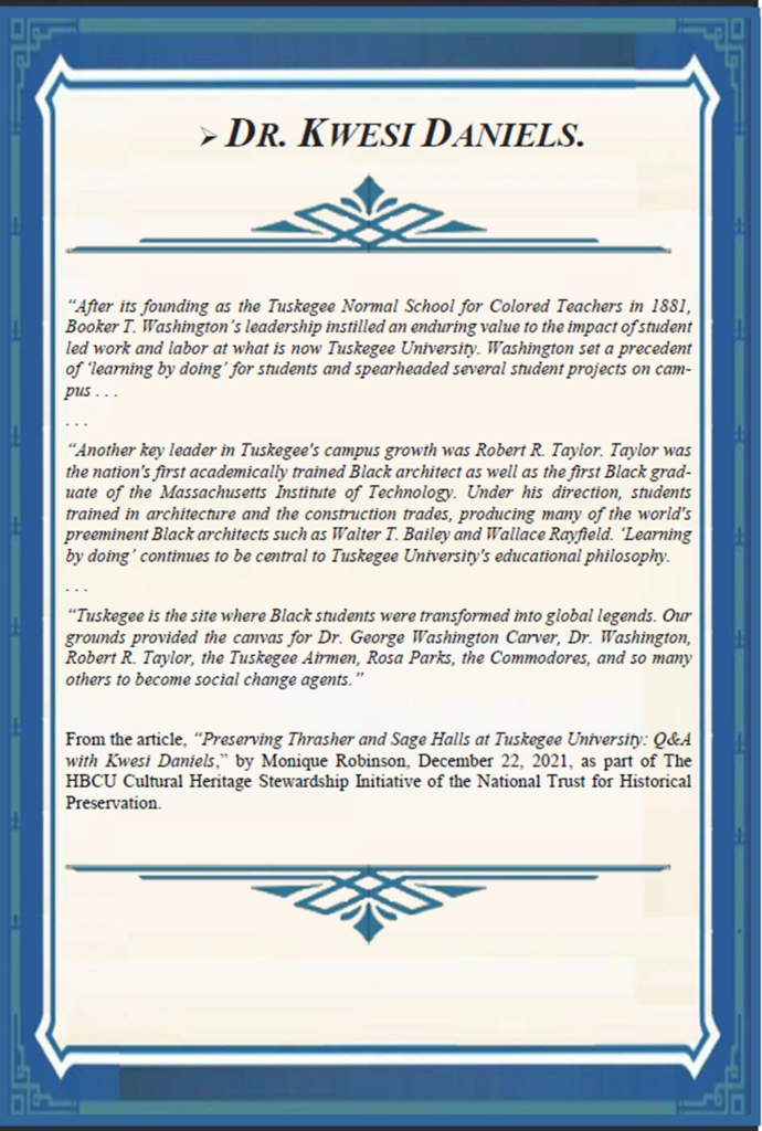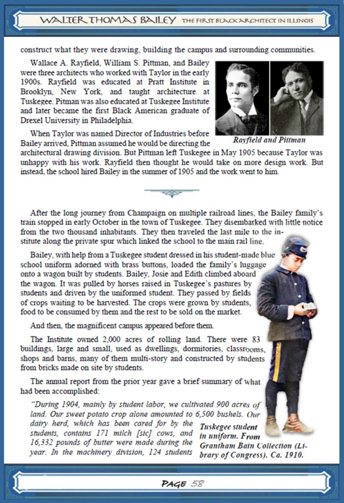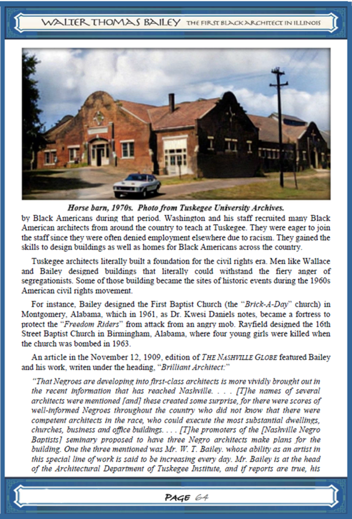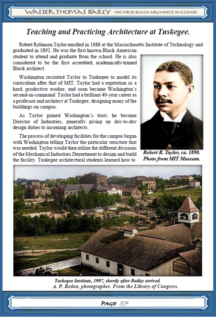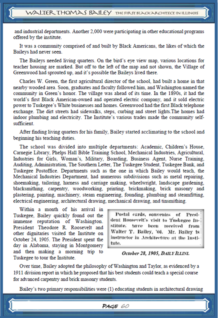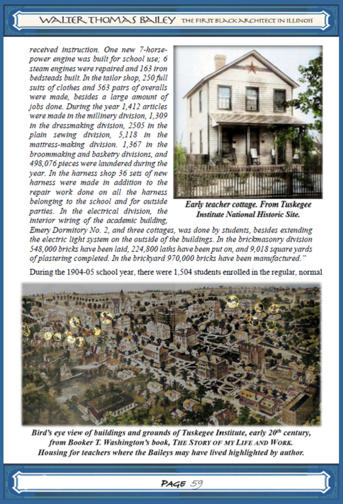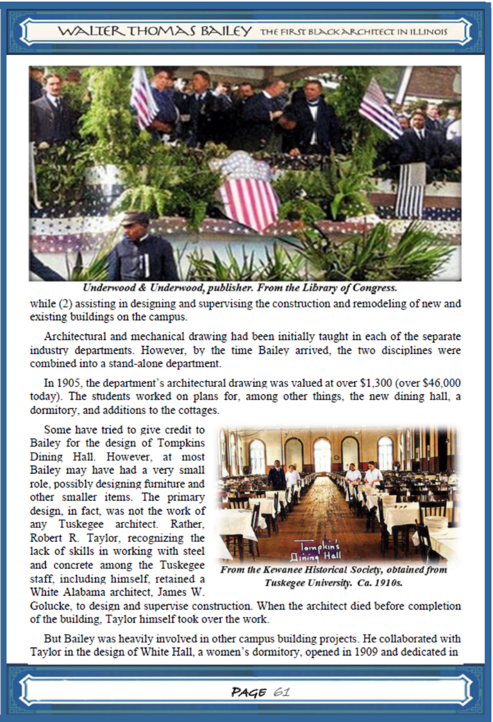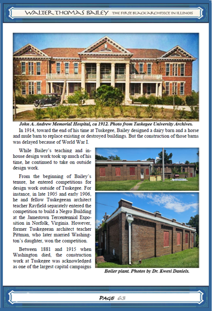 (After Walter T. Bailey earned his architectural license from the State of Illinois, Booker T. Washington, principal at the Tuskegee Institute, hired him to teach and to do design for the school. Here are chapters from my book about those special years, along with more commentary from Dr. Kwesi Daniels.)