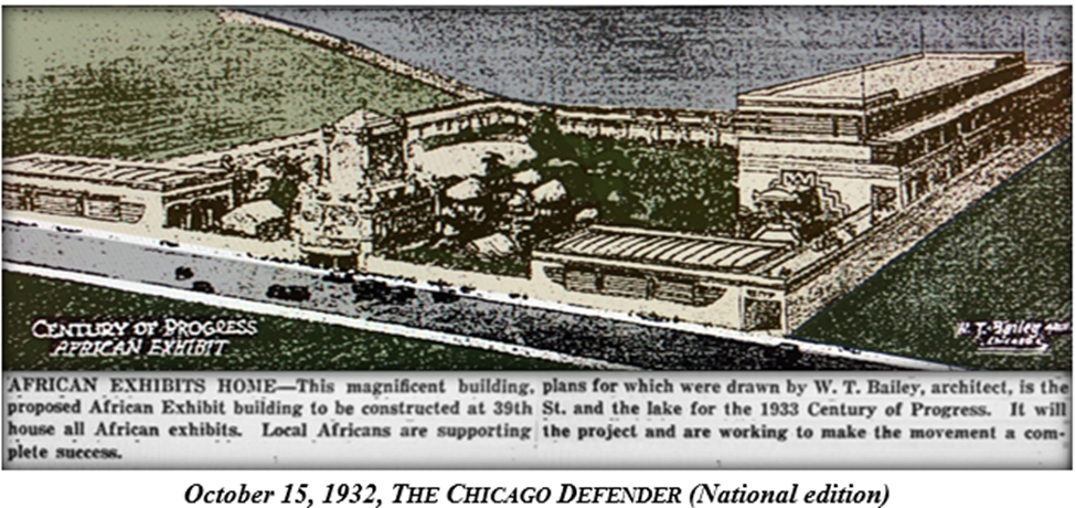 In 1930, singer Modupe Paris, a descendant of a French West African chief, engineer and architect Charles Sumner Duke, and Walter T. Bailey briefly joined forces to lobby for a Century of Progress pavilion designed to honor the advancement and achievement of the world’s Black people. (Duke later was a lead architect in the South Park Gardens / Ida. B. Wells housing project in which Bailey played a significant role.)