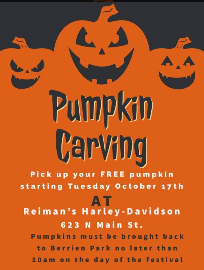 The pumpkins, donated by Frank Pumpkin Farm, are free and can be picked up at Reiman’s Harley-Davidson located at 623 N. Main St. starting on Tuesday, Oct. 17. The pumpkins need to be returned to Berrien Park before 10 am on Saturday, the day of the festival.