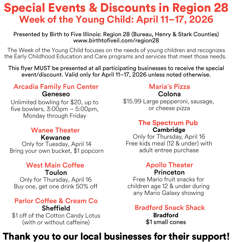 Birth to Five Illinois: Region 28 has partnered with locally owned establishments to offer a week of special deals to recognize the Week of the Young Child across Bureau, Henry and Stark counties.