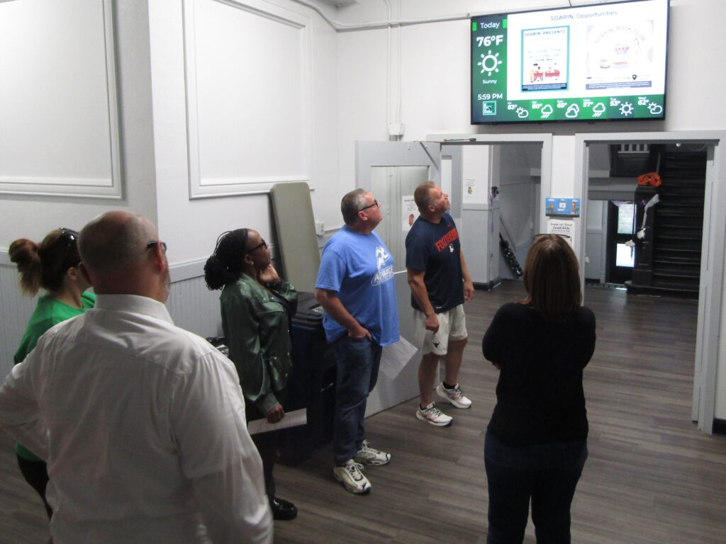 One stop on the annual building tour was the main hallway of the historic Blish Building which now houses the junior high school. New lockers in the former coat rooms, improved lighting, paint and flat screens on both floors provide a more welcoming environment for seventh and eighth graders. [Photo by Dave Clarke]