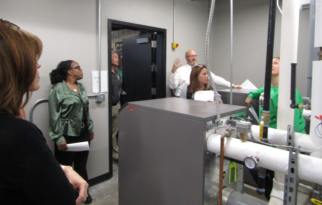 Board members get a behind-the-scenes look at the newly built boiler room which supplies the HVAC system for heating and cooling the main building. [Photo by Dave Clarke]