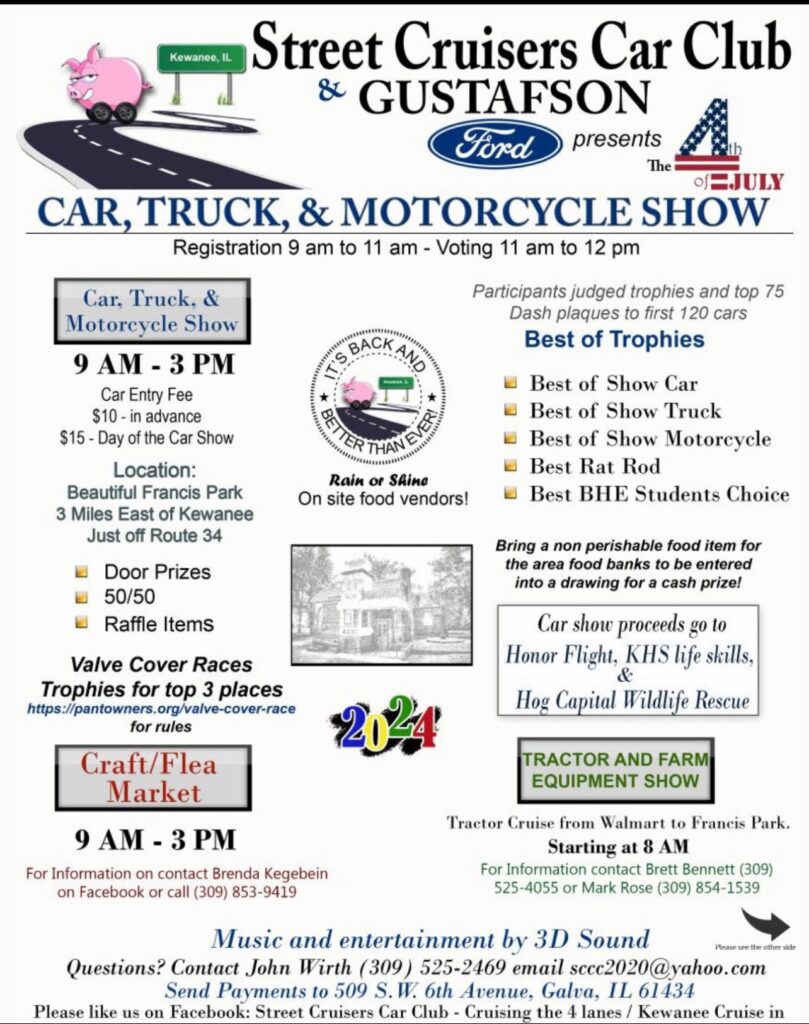 Tractor and Farm Equipment Show: The tractor cruise from Walmart to Francis Park will begin at 8 a.m. More information about the show can be obtained by contacting Brett Bennet at (309) 525-4055 or Mark Rose at (309) 854-1539.