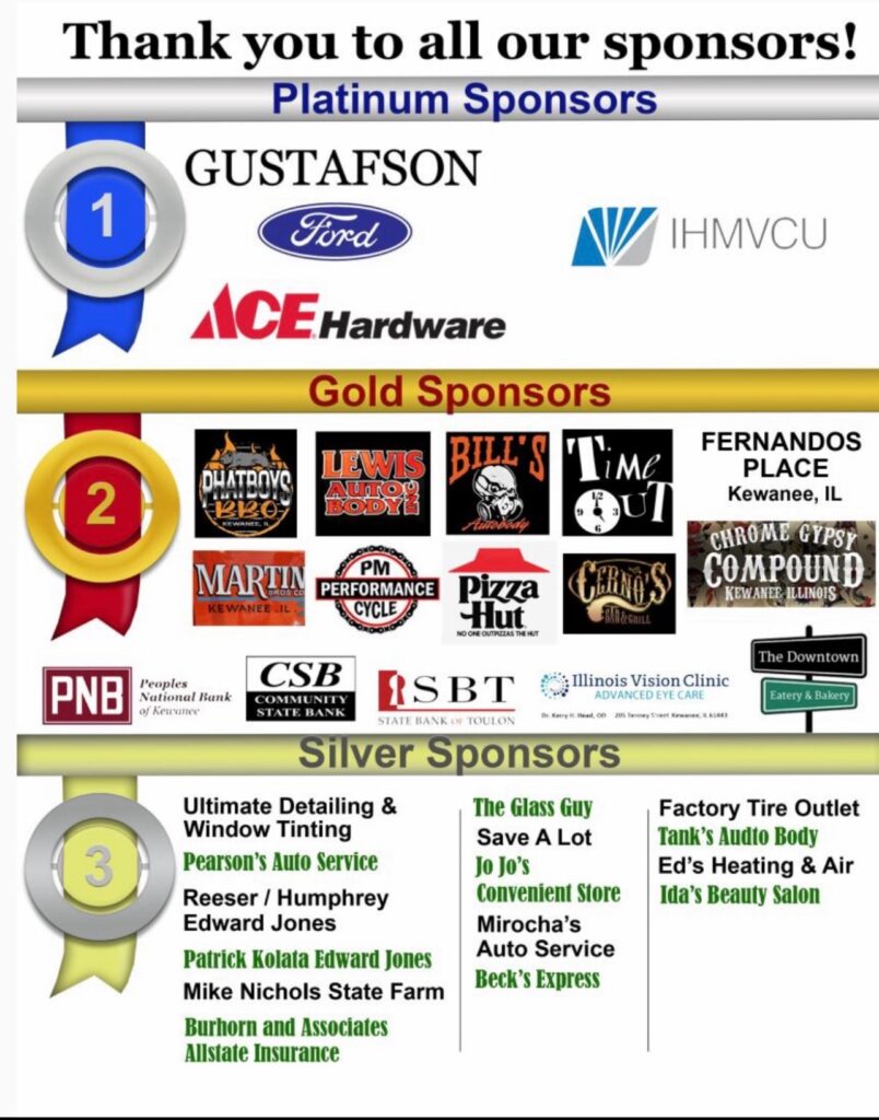 Platinum event sponsors for the car show and festival are Gustafson Ford, Ace Hardware and IHMVCU.