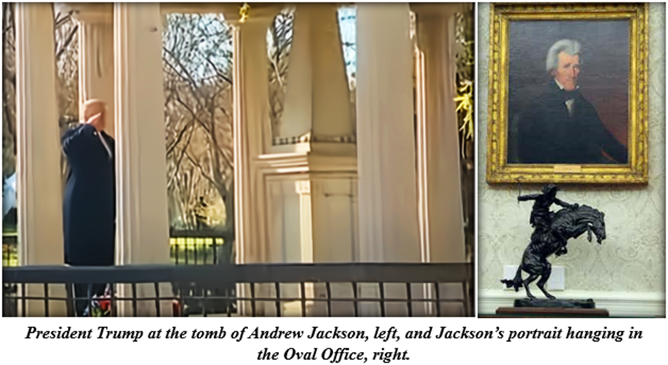 President Donald J. Trump believes that he and Andrew Jackson are cut from the same cloth. In a visit to Jackson’s plantation in 2017, President Trump called himself a “big fan,” said that Jackson was “inspirational,” and tweeted a photo of himself solemnly saluting Jackson at his Nashville tomb. In 2024, Mr. Trump continued to draw the parallel, saying that “Andrew Jackson . . . was treated worse than any other president . . . although nobody comes close to Trump.” Upon his ascension again to the presidency in 2025, President Trump brought back the portrait of Jackson to the Oval Office.