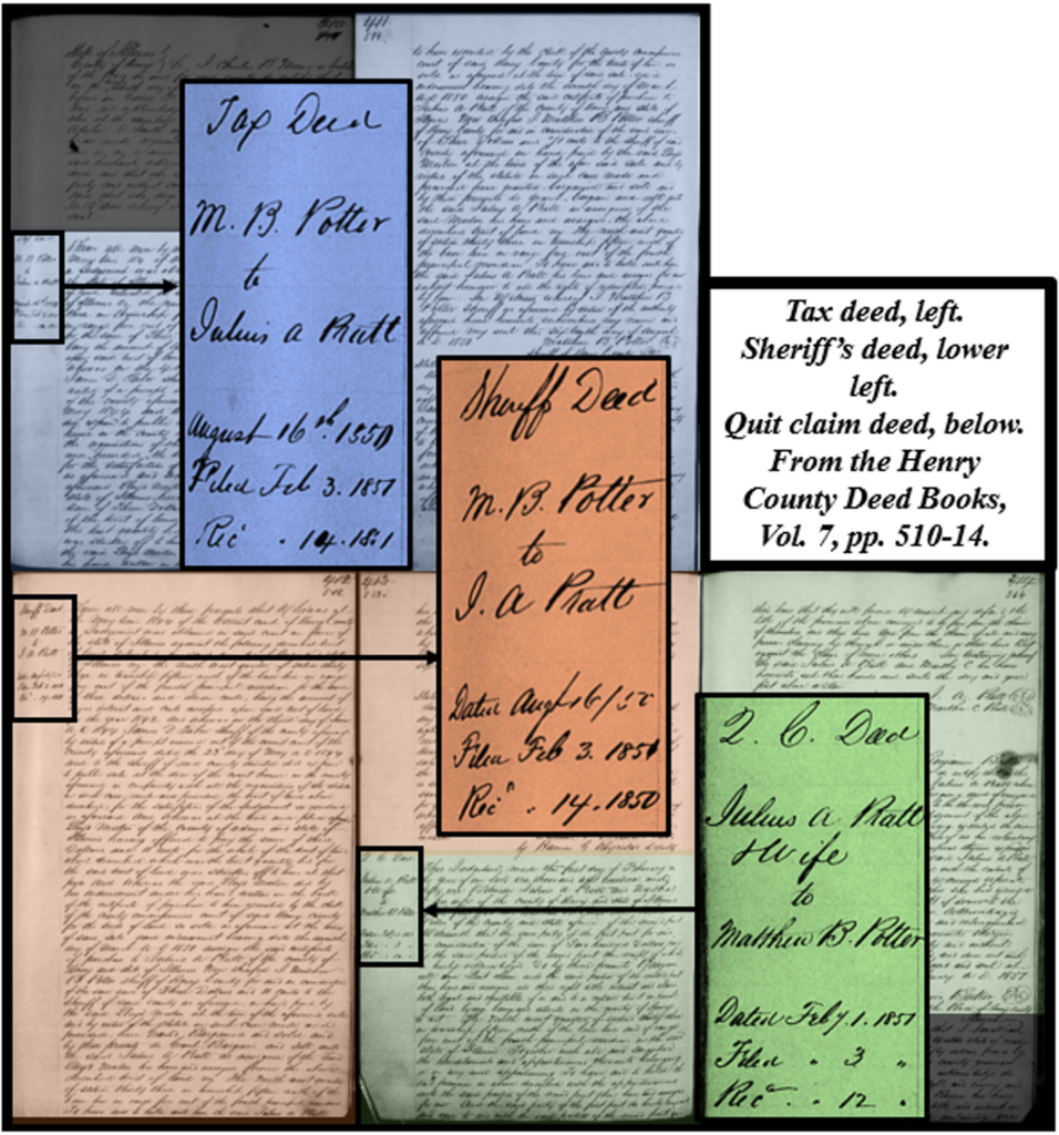 What about 1850 as the date we’re looking for? Clearly events were in motion with respect to the land by March. While the Potter brothers do not appear as buyers until a year later, it seems likely that Pratt was merely a straw man buyer. As sheriff, Matthew Potter may have been precluded from obtaining the land directly while sheriff, either by law or by a code of ethics. Specifically, the lack of proper Henry County records necessitating the tax and sheriff’s deeds and the need for the sheriff to be involved to clear clouds in the records may have lent itself to the machinations used. But after Matthew’s term ended, he and his brother would have been freed from legal or ethical constraints but, even then, paid what likely was the going cost of land rather than merely the back taxes.