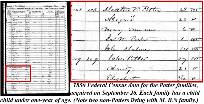 There is a wrinkle, though, which offers at least some support for 1850 as the build year. The 1850 census suggests that Matthew B. and John P. Potter and their families were living at least close to each other. The enumerator lists the brothers consecutively, albeit in different households. That does not preclude the families from living under one roof but in a duplex. But that also does not preclude them simply living next to each other.