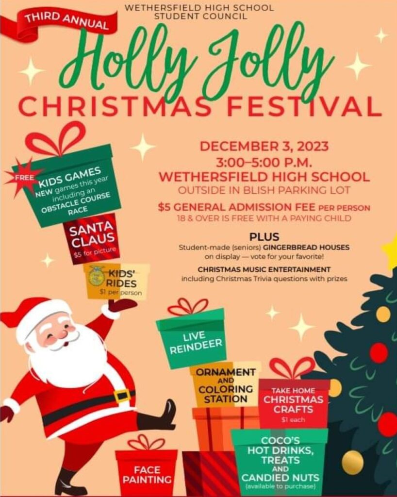 The Wethersfield High School Student Council is holding its annual “Holly Jolly Christmas Festival” on Sunday, Dec. 3 from 3 to 5 pm in the Blish parking lot at Wethersfield High School.