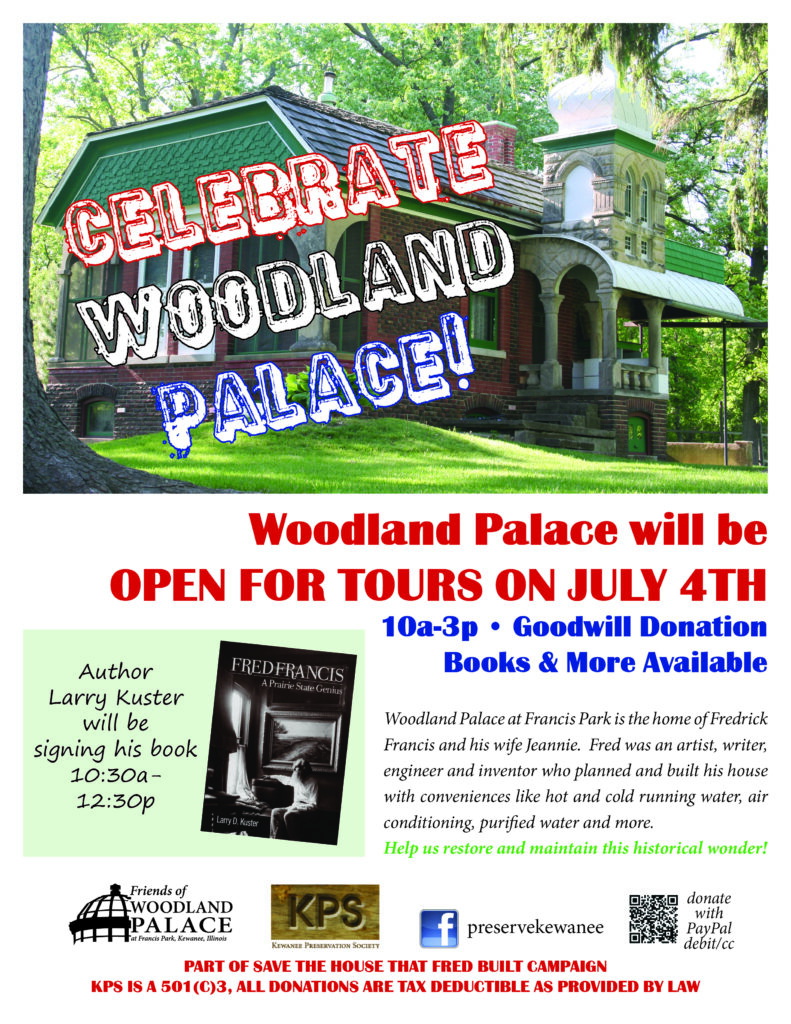 According to Kewanee Chamber of Commerce Executive Director, Mark Mikenas, the newly formed group of Friends of Woodland Palace at Francis Park will be onsite Friday offering tours and providing information. The group is kicking off fundraising efforts to help the City of Kewanee refurbish the house and do much needed repairs including a new roof, conservatory repair and general repairs throughout.